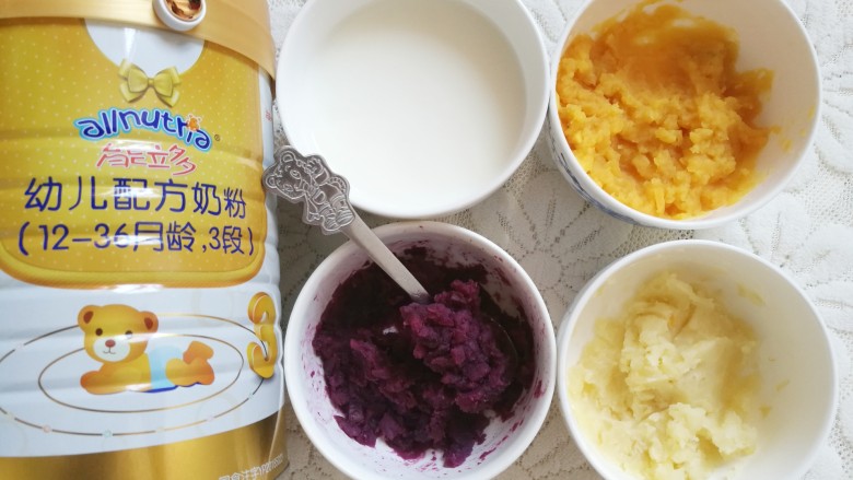 7. 舀一勺土豆泥到手心,搓成小圆球放入配方奶中。圆球的大小根据宝宝的咀嚼能力来定,同理搓好紫薯和红薯的小圆球放入。