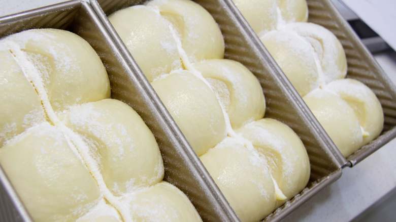 6. 发酵好的面团移至台面,微拍气,分割成每团150g的面团。