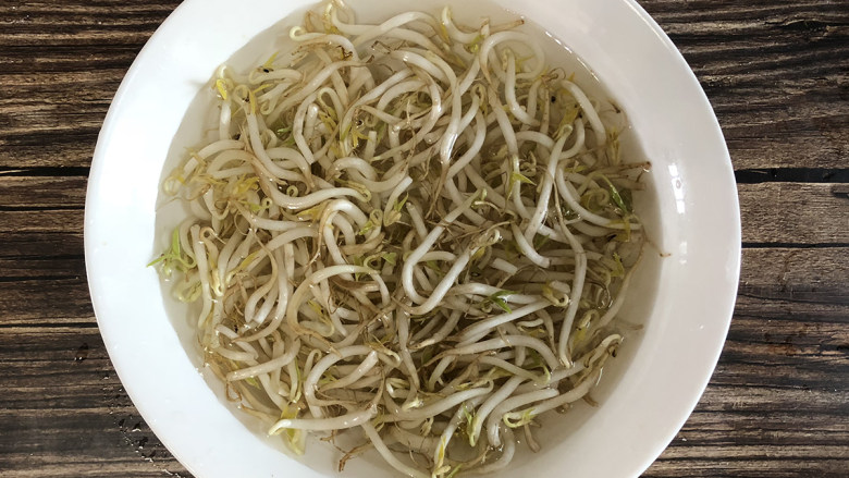 2. 将豆芽用清水清洗干净放入一个容器中,再用纯净水浸泡备用,最好用热水焯水5分钟。