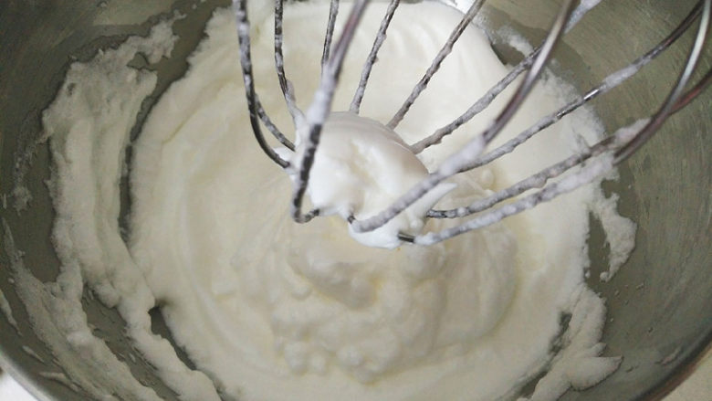 6. 将蛋清分3次加入80克白糖,打发至干性发泡