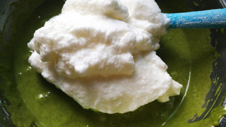 7. 将三分之一蛋白霜加入蛋黄糊用蛋抽搅拌均匀