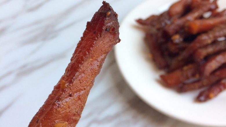 2. 猪肉条比食指略粗。 太细了没口感,太粗难烤干。