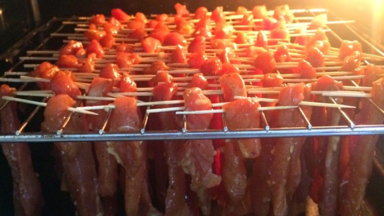 8. 用牙签扎入肉的一端,放在网架上。 注意肉之间留一点空隙。 我不建议立即烘烤,最好晾一晾,滴干水分后再烤。 如果不赶时间就晾到表面风干,可以缩短烘烤时间,省一些电。