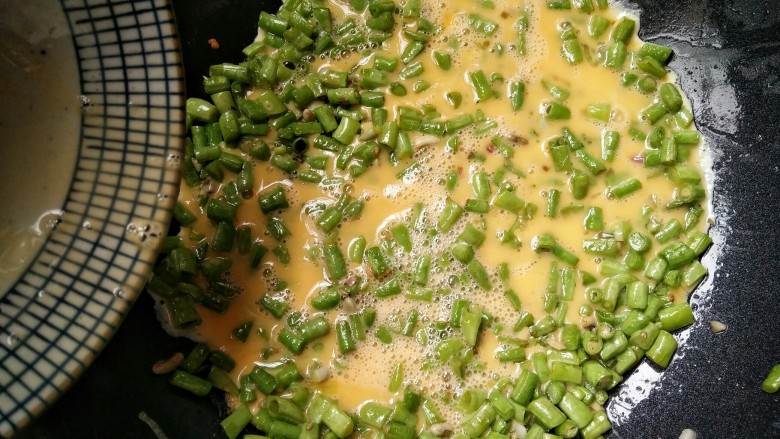 5. 在鸡蛋中加入10毫升料酒打散,将打散的蛋液均匀淋入锅中炒至变色的豇豆上。