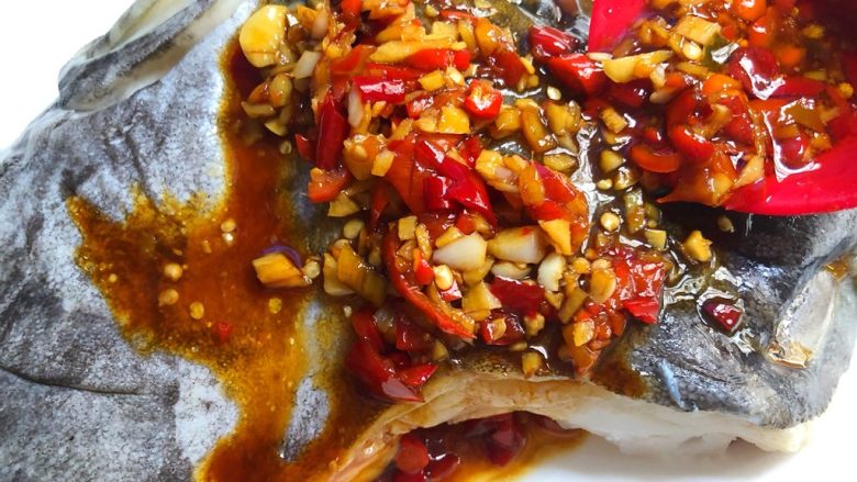 5. 把炒好的剁椒均匀浇到鸦片鱼头上面