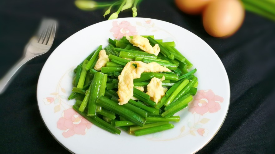 - 热锅热油倒入蛋液,用筷子滑散至蛋液快完全凝固,划成小块盛出。韭苔翻炒变色放入盐,糖从锅边淋入一勺热水,放入蛋块翻炒均匀。
