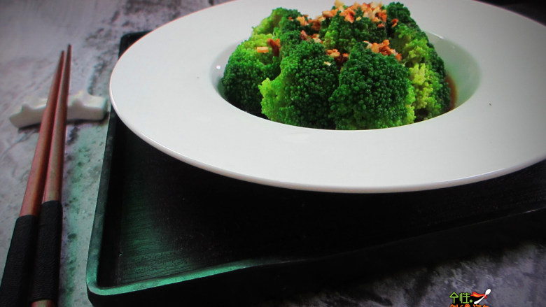 8. 将酱汁浇到西兰花上,撒上酥脆的蒜蓉即可