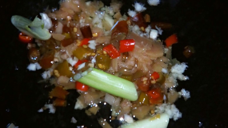 6. 炒锅倒油,小火炒香蒜粒,泡椒粒、泡姜粒和葱段。