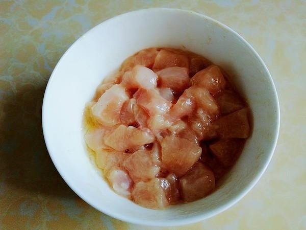 1. 先把鸡胸肉洗净切丁,放入盐、十三香、料酒抓匀,再放入生粉抓匀,最后淋入花生油抓匀,腌制片刻。 提示:要想鸡胸肉不干不柴,一定要提前腌制,不可以忽略哦!