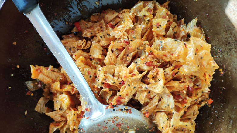 3. 锅里入油放小米椒,大蒜子爆香,油多放一点,豆皮吸油