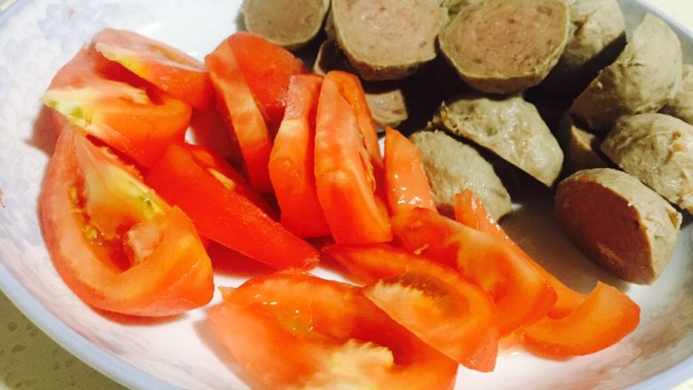 2. 番茄剥皮,切小块状,牛肉丸对半切开