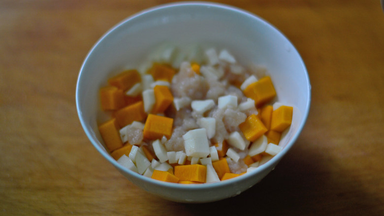 7. 夹去腌制的姜片,将南瓜与山药一起放入鸡肉碗中