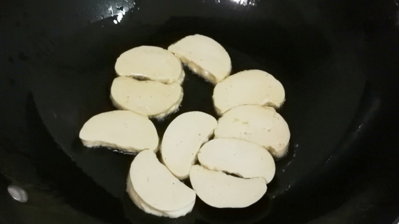 3. 热锅倒入适量食用油烧热,放入素鸡中火煎