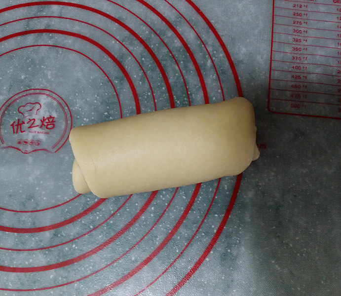 11. 3个面团一起卷好后,用刮板从每卷的中间切开,如图