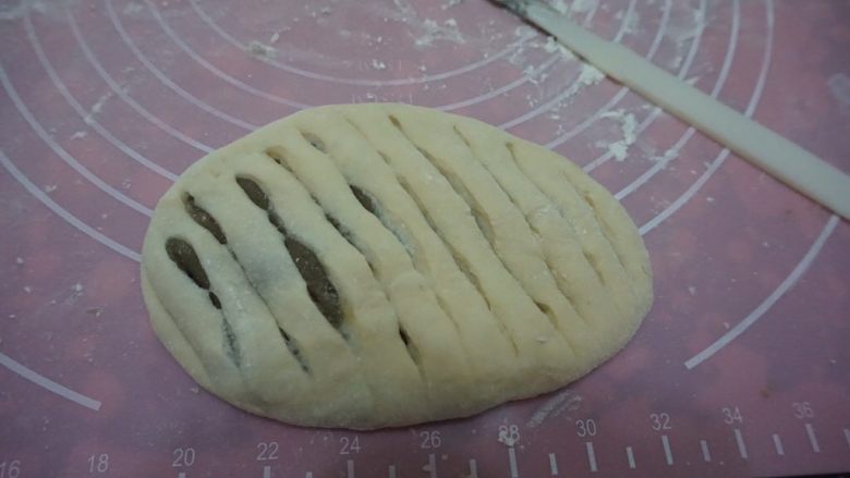 9. 然后再次将面团擀成扁椭圆形,用面包刀在面皮上划十几刀,不要划断