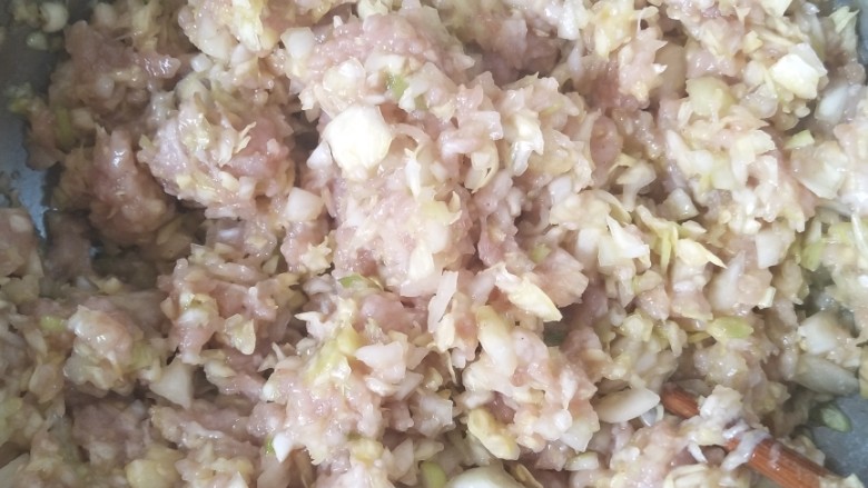 1. 猪肉剁碎,加一点水顺时针搅拌