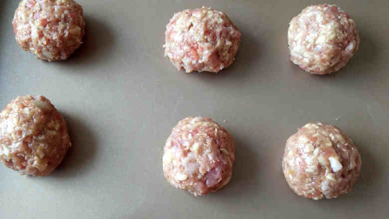 10. 将肉馅团成大小相同的丸子,放在烤盘里;