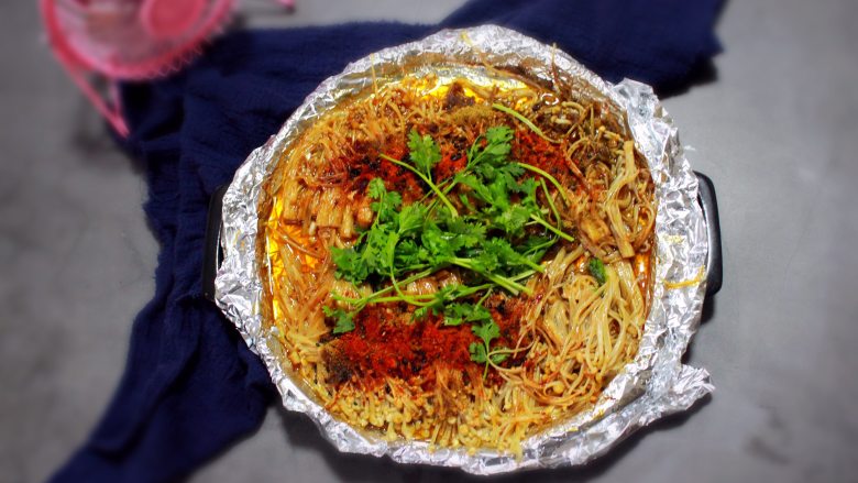 5. 烤箱拿出来翻下金针菇。
