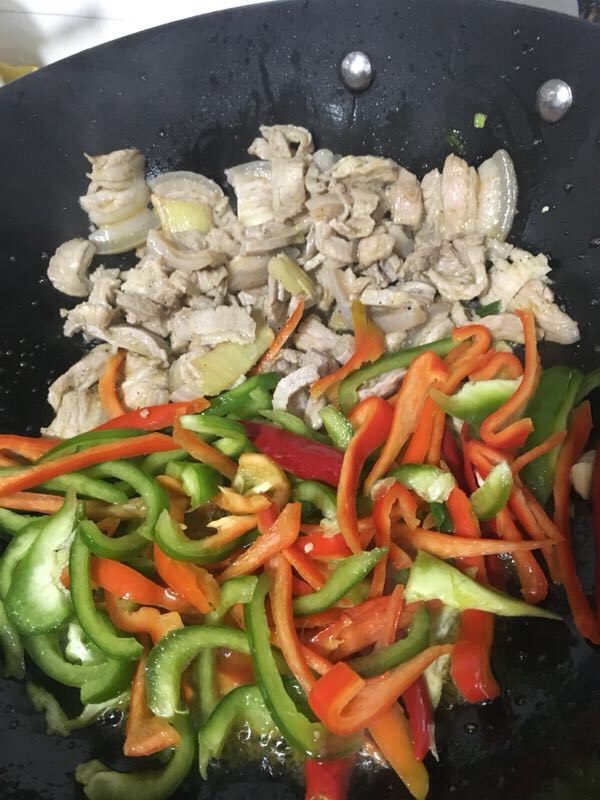 6. 肉片先煸炒,之后再加入青椒尖椒红椒