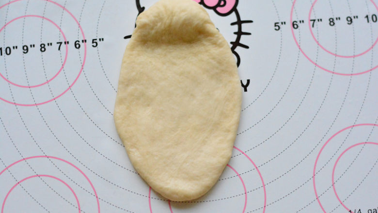 7. 醒发好以后,进行擀卷,上面留一点,下面擀成椭圆型