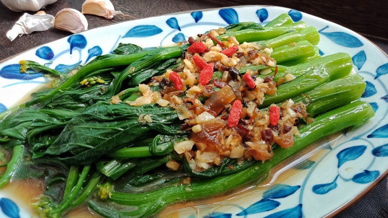 9. 倒在菜心上,加入几颗枸杞点缀下