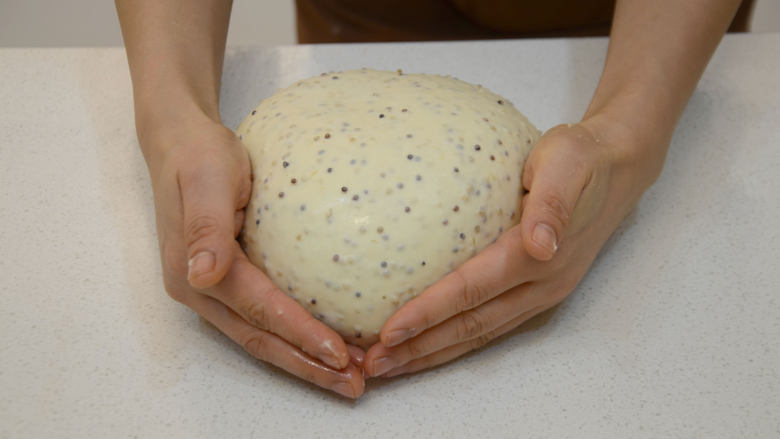 8. 面团取出,手动折叠整理,至藜麦分布更均匀。
