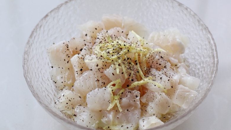 1. 龙利鱼提前解冻,洗净后用厨房纸拭干表面水分,然后切成1.5厘米见方的块状