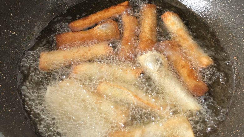 14. 锅中放油烧热,用筷子放进去可以看见周围有密集的小热泡就可以放春卷炸了