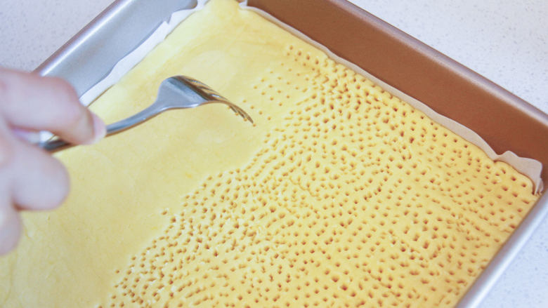 8. 将面饼放入垫油纸的CM-719 方形烤盘中,并用叉子在底部扎孔,再放冰箱冷藏约20分钟。