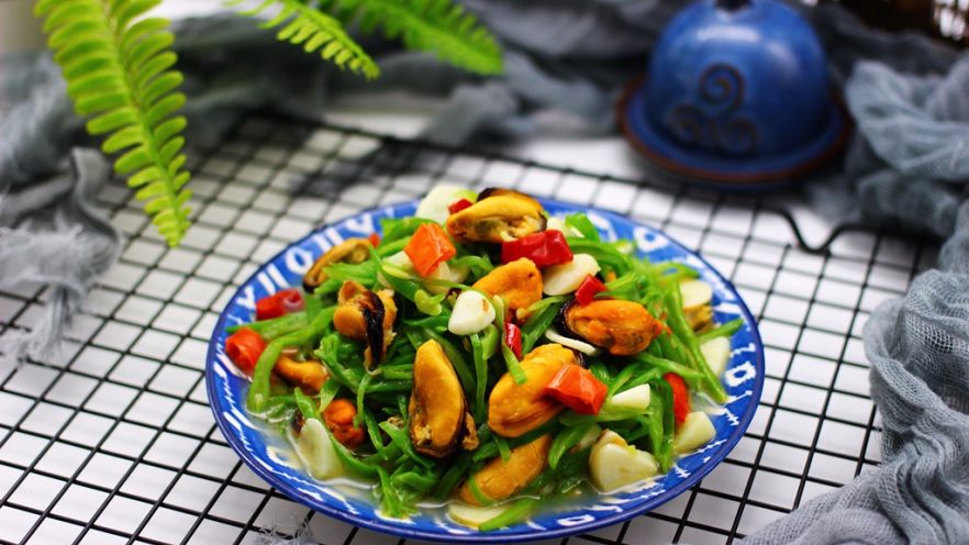 14. 把炒好的芸豆丝爆炒海虹肉盛到盘子里