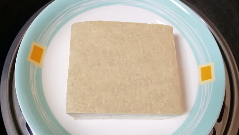2. 老豆腐上锅蒸10分钟,一是去除豆腥味,二是蒸过的豆腐吃起来更劲道。