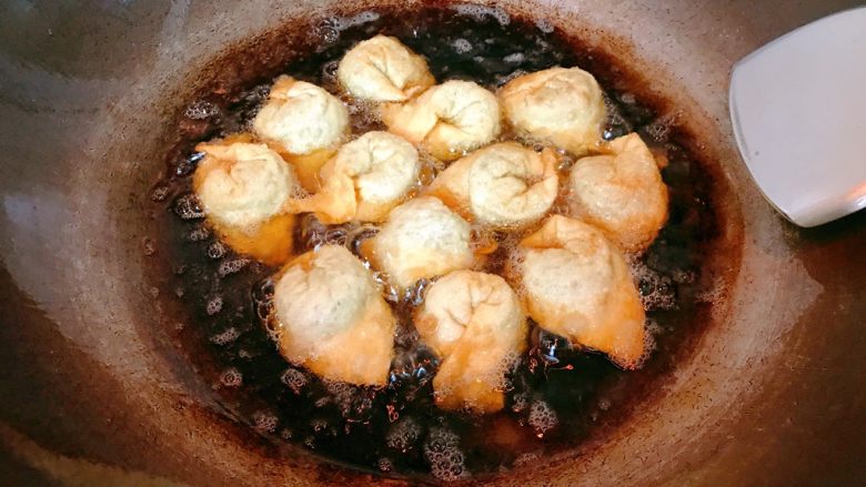 9. 锅中热油至九成热,放入饺子,中小火炸。