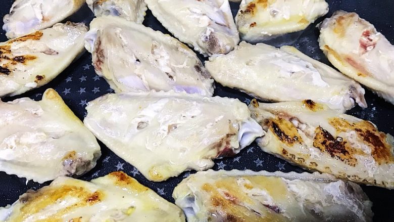 3. 平底锅烧热(无需用油 鸡翅再煎的过程会煎出油脂)