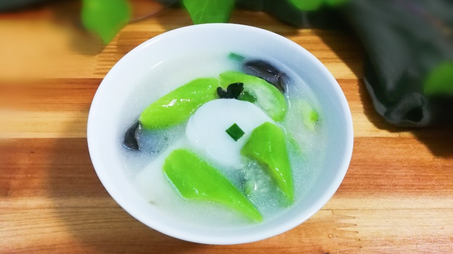 - 黑木耳提前冷水泡发,洗净,小锅水开,放入一小勺盐,放入黑木耳烧开继续烧一分钟。热锅凉油放入葱白煎出香味,放入丝瓜,放入一小勺盐翻炒变色,放入年糕放入黑木耳烧两分钟,放入一小勺盐,少许鸡精,撒入葱花。