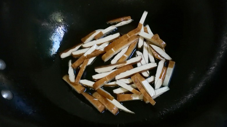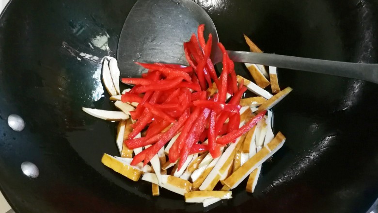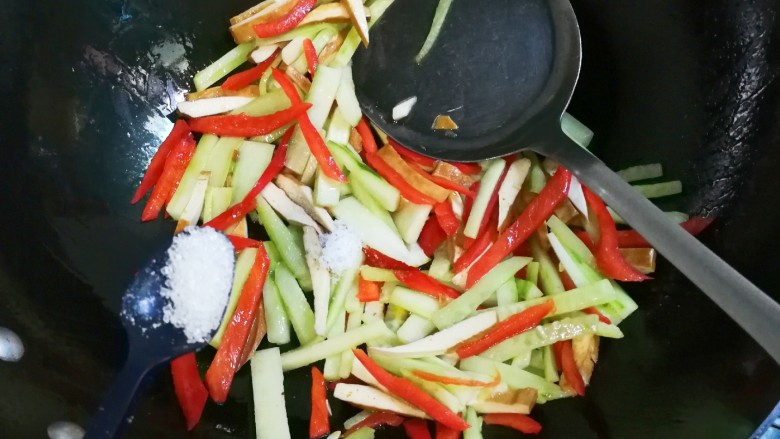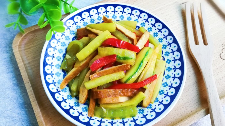 - 黄瓜削去皮切成条,五香干清洗一下切成条,红椒洗净去籽切成条,热锅凉油放入蒜粒煎出香味,放入五香干翻炒片刻,放入红椒翻炒片刻,放入黄瓜翻炒均匀,放半小时盐,放半小勺糖,放适量生抽翻炒均匀。