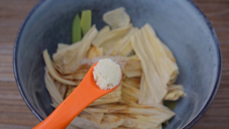 5. 把西芹和腐竹放入容器中,加入味极鲜酱油