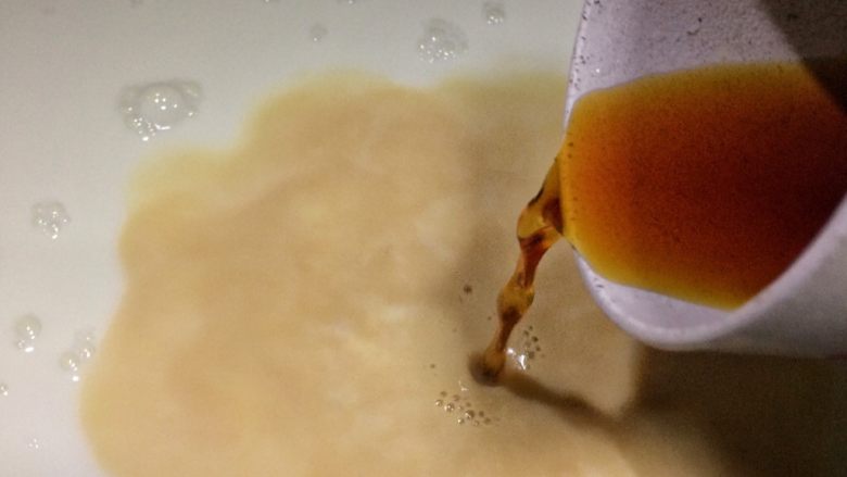 6. 将搅拌好的龟苓膏糊倒入糖水中,边倒边不停地顺一个方向快速搅拌均匀。