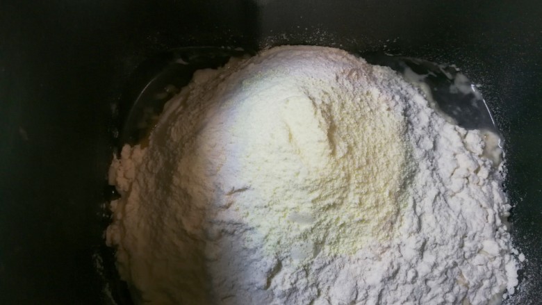 - 将面包粉扒开一个小洞,放入耐高糖发酵粉再埋起来。启动面包机自定义和面,打开面包机盖子和面四十分钟。搅拌均匀成表面润滑的面团。盖上面包机盖子发酵两倍大,启动自定义烘烤四十五分钟,自定义烘烤时间可以按照自己面包机火力来调整。