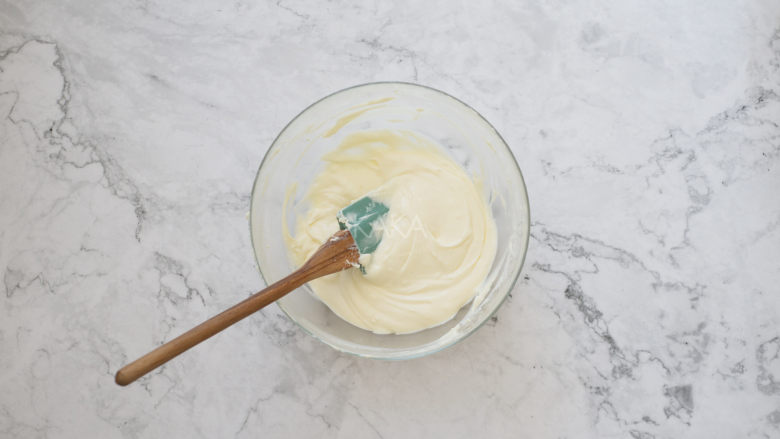 4. 软化后的奶油奶酪加细砂糖用刮刀轻轻压拌混合(隔水加热),搅拌光滑无颗粒