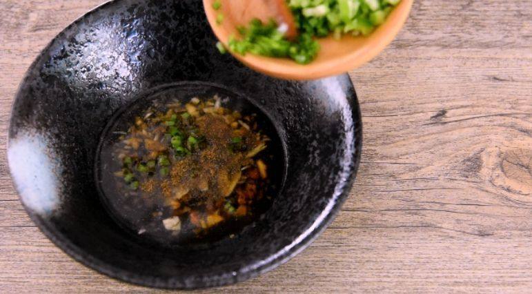 5. 碗中倒入酱油、醋、蒜姜水、花椒粉、糖、辣椒油、葱,拌匀