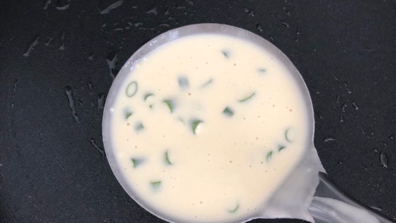 5. 锅放少许油抹均匀烧热,放一勺面糊,转动锅或者用木铲摊圆形