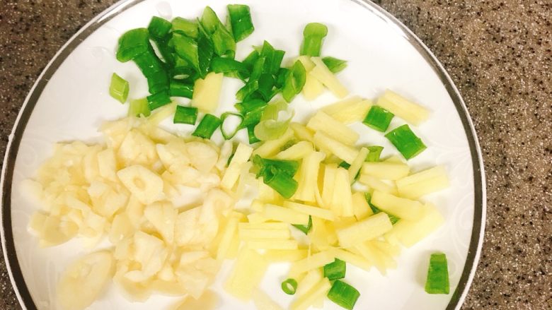 2. 生姜切丝,蒜切片,葱切碎,备用。