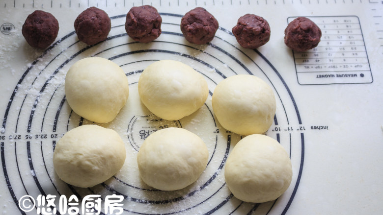 7. 取出面团按压排气,平均分割为6分,小面团滚圆后静置15分钟。豆沙馅也分成均等的6份待用。