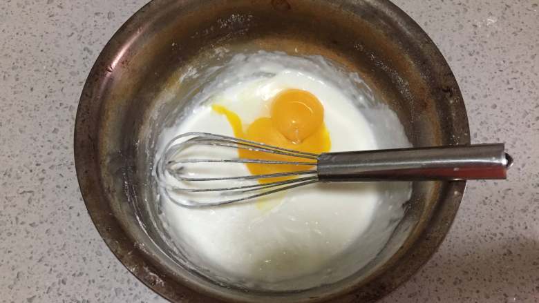 3. 接下来,我们把蛋黄和蛋清分离,蛋黄全部加入到面糊中后再次搅匀,放置待用。