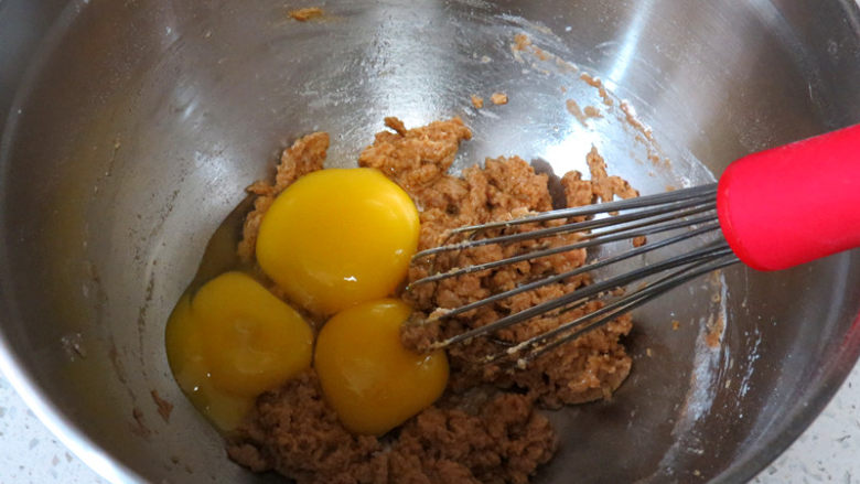 4. 加入蛋黄拌匀;用橡皮刮刀从盆的底部边缘往中间搅拌均匀,不要总是朝一个方向划圈搅和,防止起筋