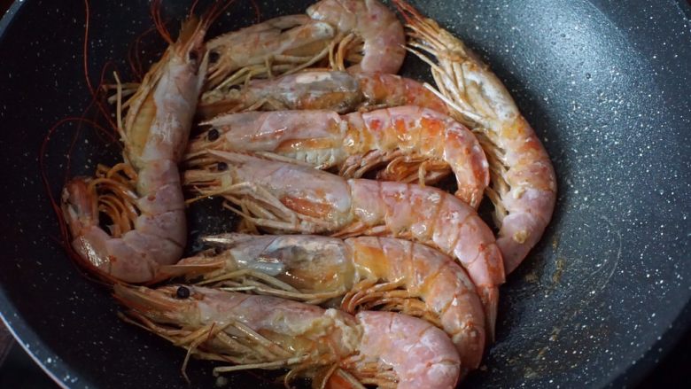 5. 然后将蒜瓣捞出,放入处理好的虾中火煎