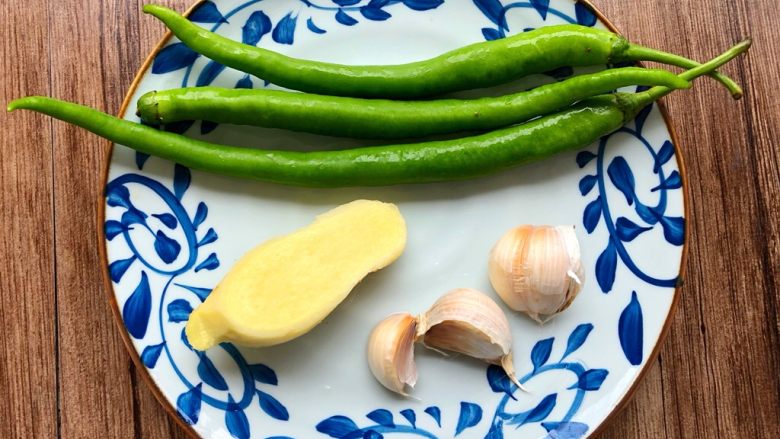 3. 青辣椒洗净切块,生姜切丝,蒜头去皮切末