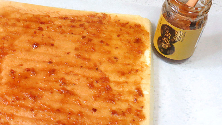 16. 把晾凉的蛋糕片再倒扣过来,没有图案的一面朝上,四周边切平,抹上梅子酱