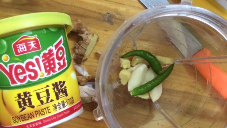 8. 做蘸酱,蒜姜辣椒和黄豆酱加一点醋打成泥,加点白糖和酱油调味即可。