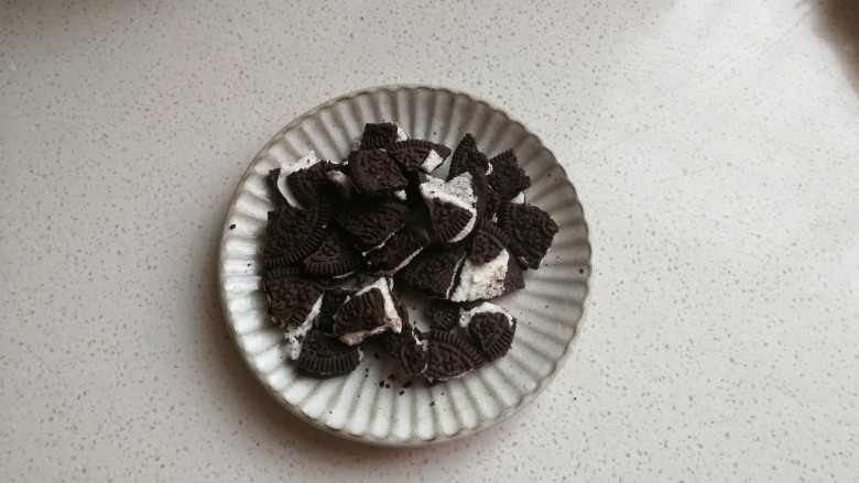 3. 再把奥利奥饼干掰成小块,也是随意掰成大小不同的小块。